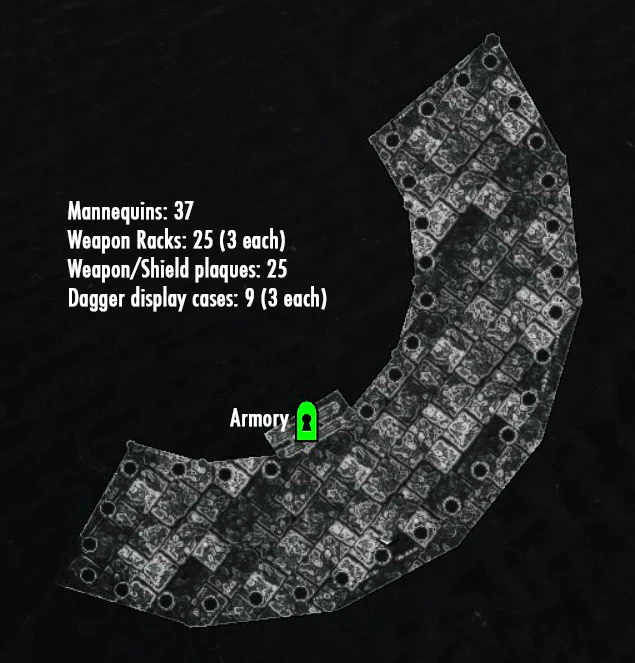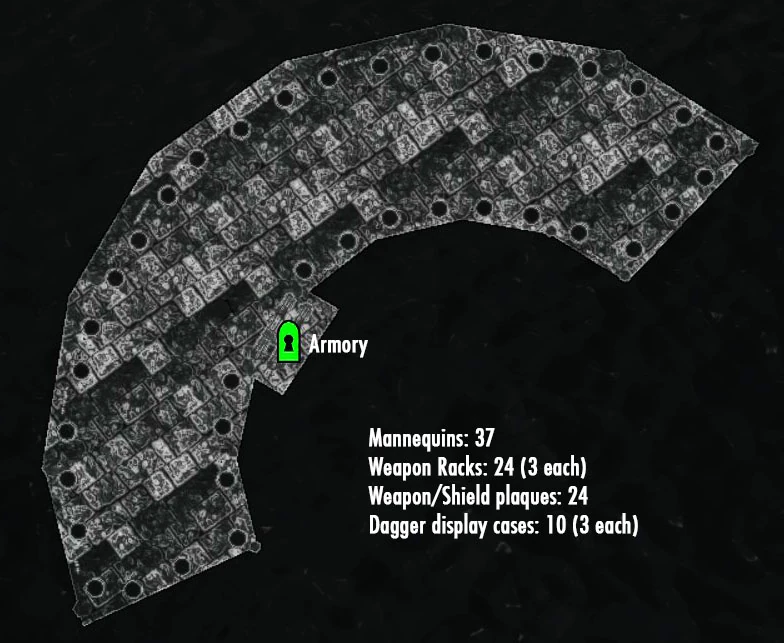 This means that in total you have 74 mannequins, 49 weapon racks, 49 weapon/shield plaques and 19 dagger display case racks you can fill any way you want. Some people dedicate each room to one type of armor (clothes for mages, light armor, heavy armor), but it is completely up to you how you want to do it.